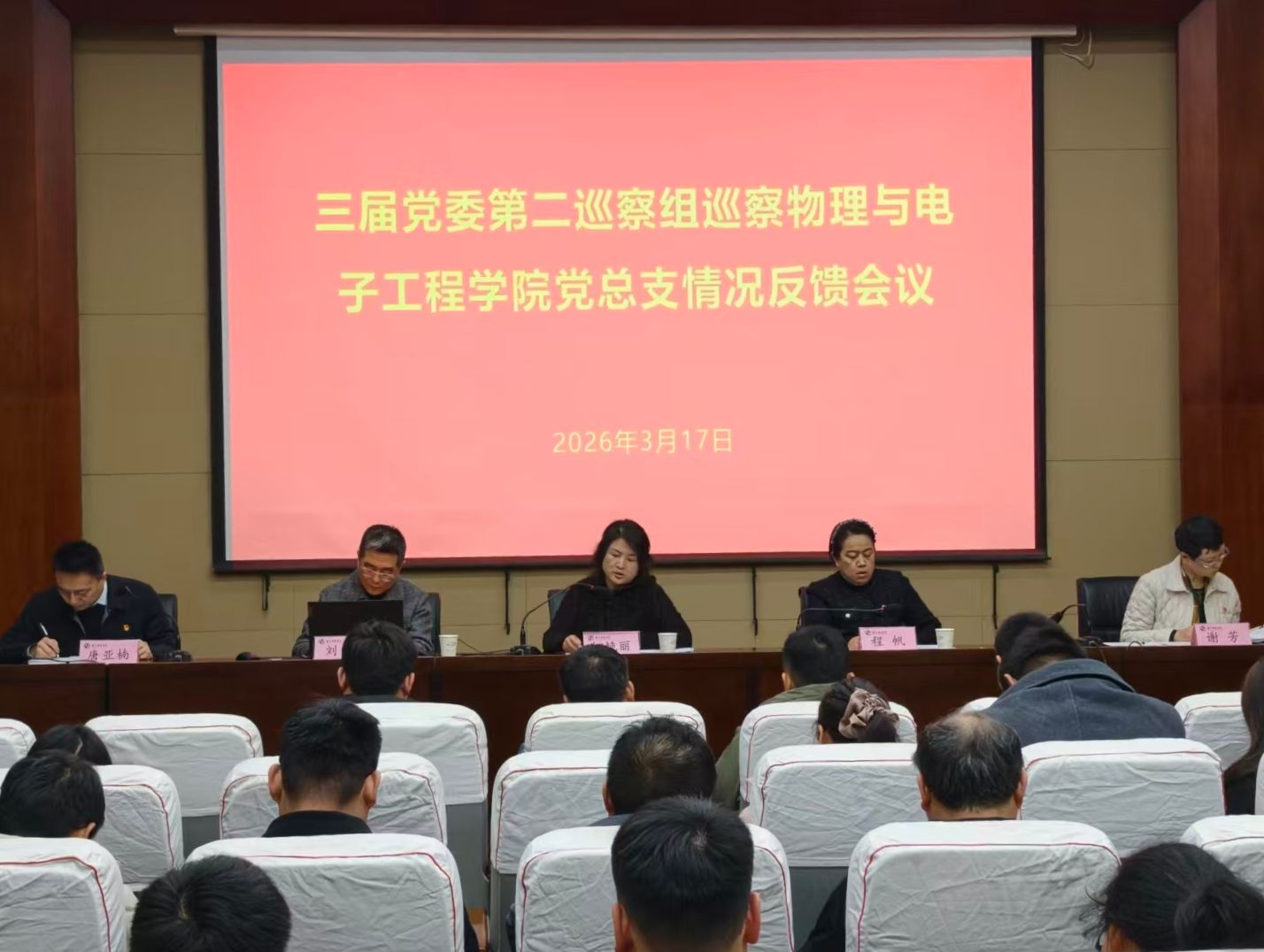我校党委组织部、纪委相关负责同志,巡察组全体成员,我院党政领导班子成员、内设部门负责人、全体教职工及部分学生代表参加会议。会议由我院党总支副书记、院长唐亚楠主持。