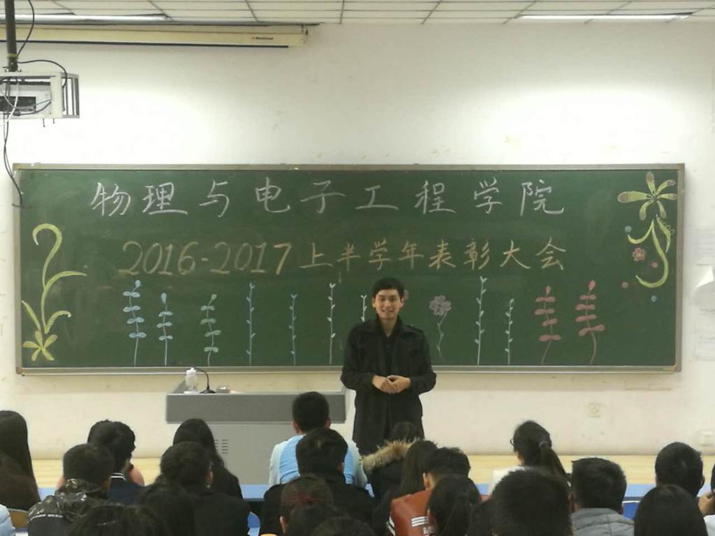 2016年11月1日下午一点整,物理与电子工程学院于西校区四阶三举行了2016-2017学年第一学期的表彰大会。本次表彰大会由学生会副主席杨昊宇主持。