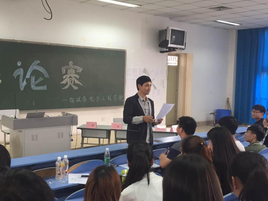 2016年4月26日下午14时,物理与电子工程学院在老校区四阶三举办了第二届辩论赛。物理与电子工程学院团总支何卓书记出席并观看了这次辩论赛。辩论赛的辩题有:举报作弊的对错、这是不是一个看脸的时代、人到了三十岁是应该追求梦想还是踏实工作、大学生创业的利弊。
