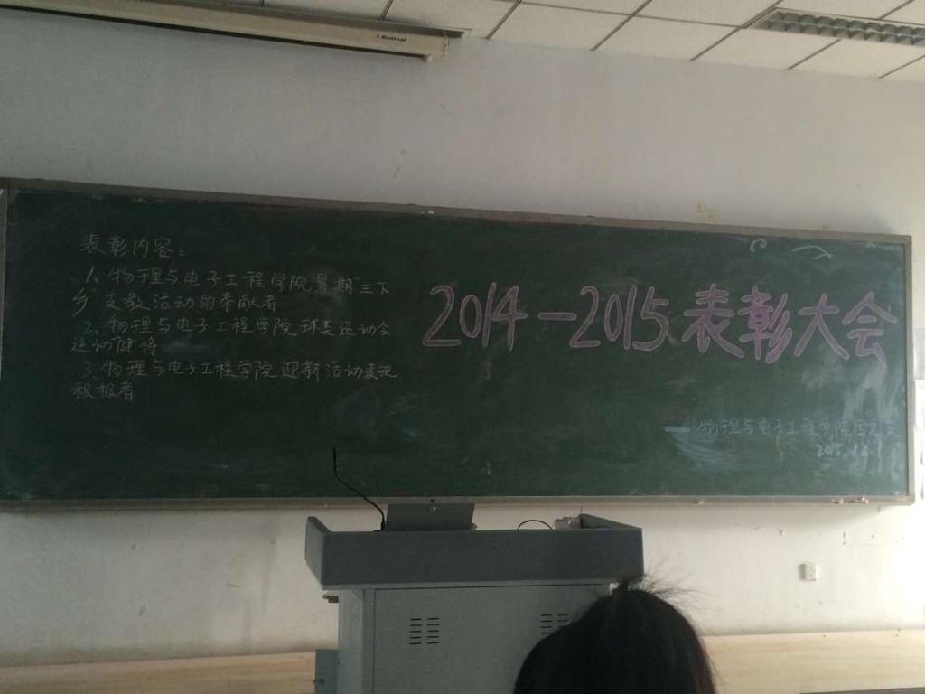表彰大会第一项是表彰在暑期下乡支教的同学。物理与电子工程学院学生会负责人王玮瑒同学生动的讲述了暑期下乡支教的经历使人印象深刻。讲述了在暑期下乡支教的感人故事,特别是在三门峡时王乾同学为同学打伞的故事。第二项是对球类运动会中的运动健儿的表彰。特别是男篮在今年的比赛中获得的优异成绩,篮球队队长王玮陽同学用生动的语言介绍了篮球队的传承精神和拼搏精神。第三项是对开学时迎新的积极分子进行表彰,正是因为他们的付出,15级同学的报名才有条不紊的进行。以上各项奖项均由何书记亲自颁发,并对获奖的同学提出鼓励。最后团总支何卓书记对被表彰同学所取得的成绩给予充分的肯定,并鼓励在座的同学们积极报名参与到各项活动中来。