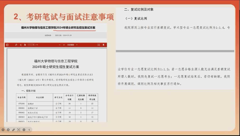 针对复试与调剂这一关键阶段,唐亚楠院长结合多年指导经验,为同学们系统梳理了核心备考要点与实操策略。在复试准备方面,院长强调,要精准核对专业排名,明晰目标院校招生计划,充分借助学长学姐经验、院校官方简章等权威渠道夯实备考资料;笔试要注重夯实基础、全面复习,面试则应主动对接导师,精心打磨个人简历与自我介绍,充分挖掘自身优势特长,熟练掌握毕业论文、学科竞赛、实践经历等核心内容,同时积极调整心态,以自信从容的状态迎接考核。