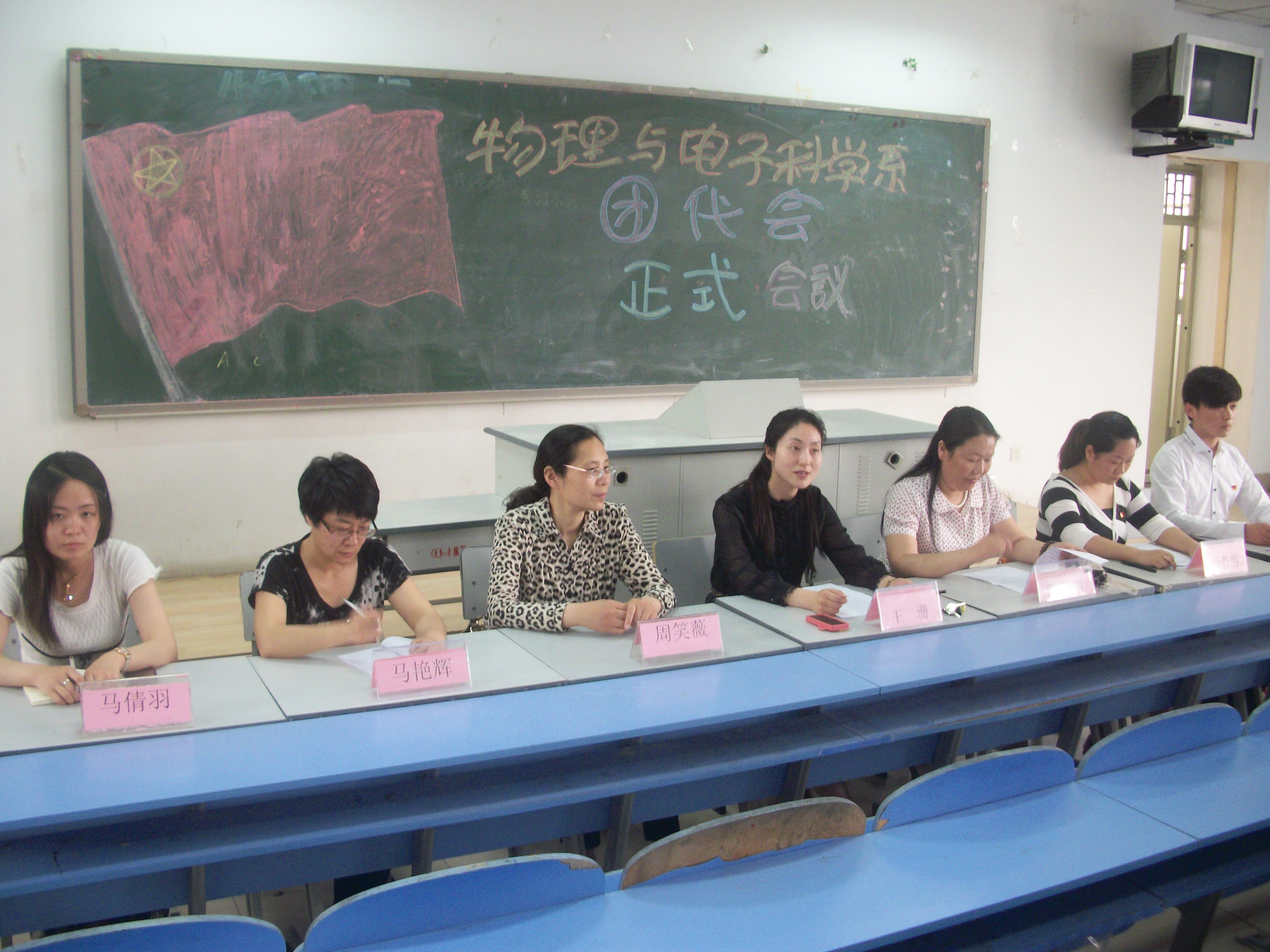 物理与电子科学系于2013年5月14日下午在四阶三召开了第一次团代会,出席会议的有校团委书记王珊,物理与电子科学系书记海萍丽,团支部书记韩若男,主任周笑微,马艳辉、马倩羽老师及学生代表。