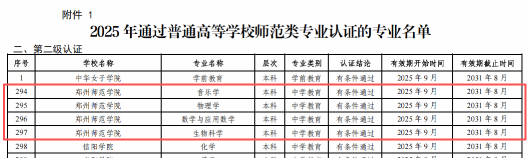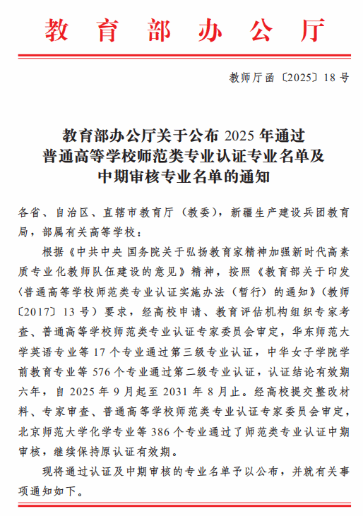 学院新闻近日,教育部办公厅发布《关于公布2025年通过普通高等学校师范类专业认证及认证中期审核专业名单的通知》(教师厅函〔2025〕18号),我院物理学专业通过教育部师范类专业第二级认证,认证结论有效期为六年。这标志着我院物理学师范专业的人才培养质量得到了国家权威标准的认可,是专业建设与发展历程中的一个重要里程碑。